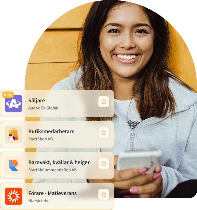 En plattform av ungdomar, för ungdomar, där du kan hitta, söka och få jobb snabbt. Vi samlar de bästa jobben på ett och samma ställe, så att du enkelt kan hitta och söka ditt nästa jobb på bara några minuter.